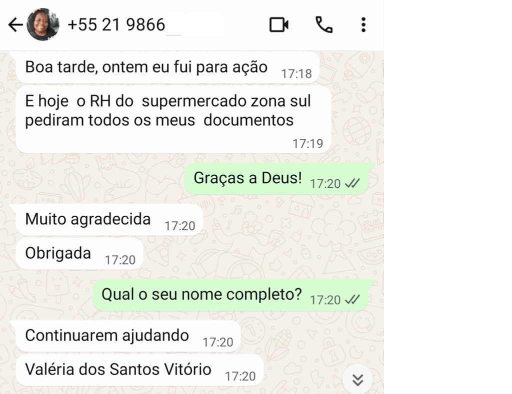 Testemunho da VALÉRIA DOS SANTOS VITÓRIO que participou da Ação do Gerando Vidas na quinta-feira, 7 de Agosto, e conseguiu o trabalho.
