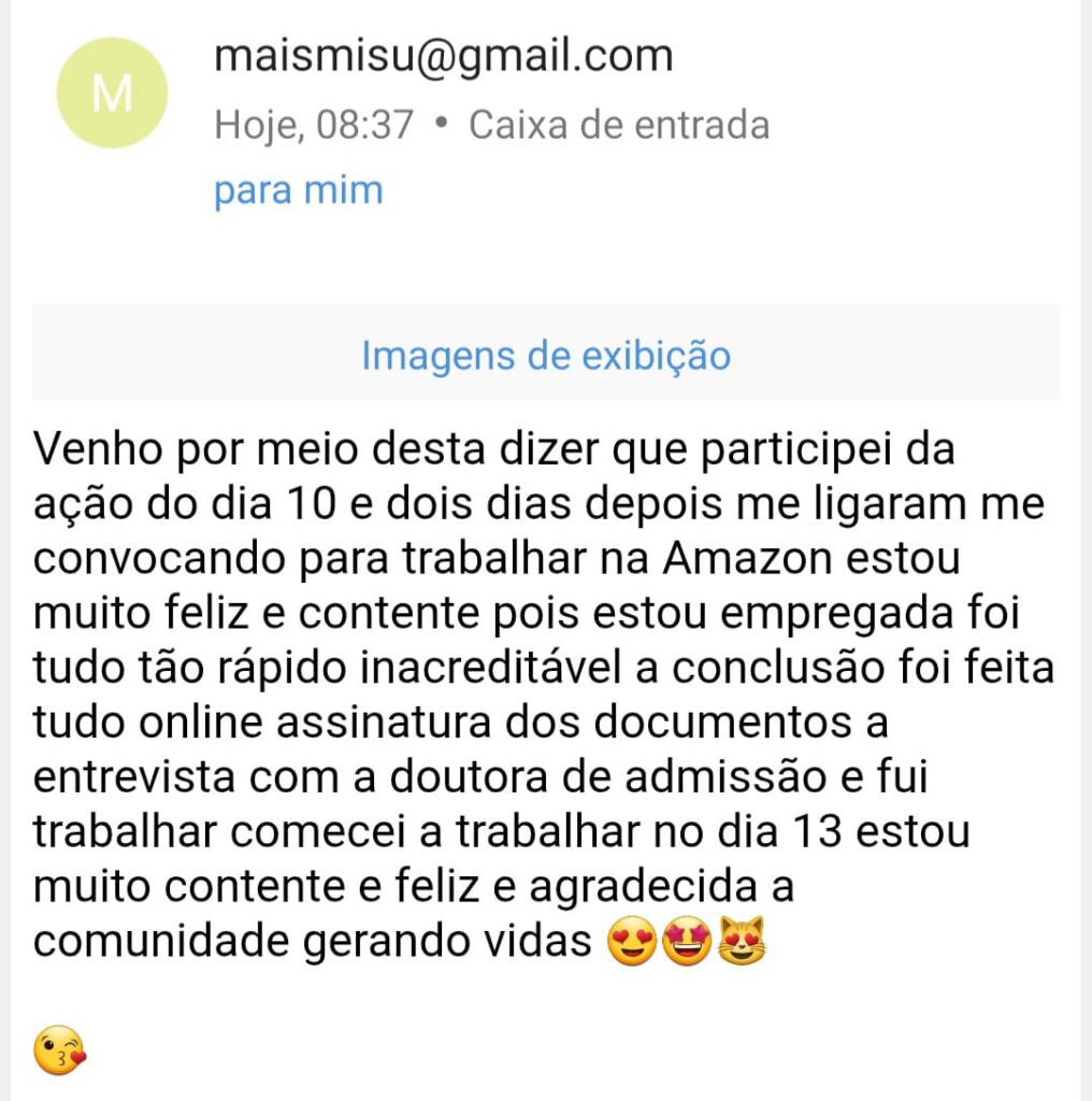 Testemunho da MAISA OLIVEIRA DOS SANTOS, que participou da Ação de Empregos da Comunidade Católica Gerando Vidas e conseguiu o trabalho na empresa Amazon, na função de de Auxiliar de Operações Logísticas.