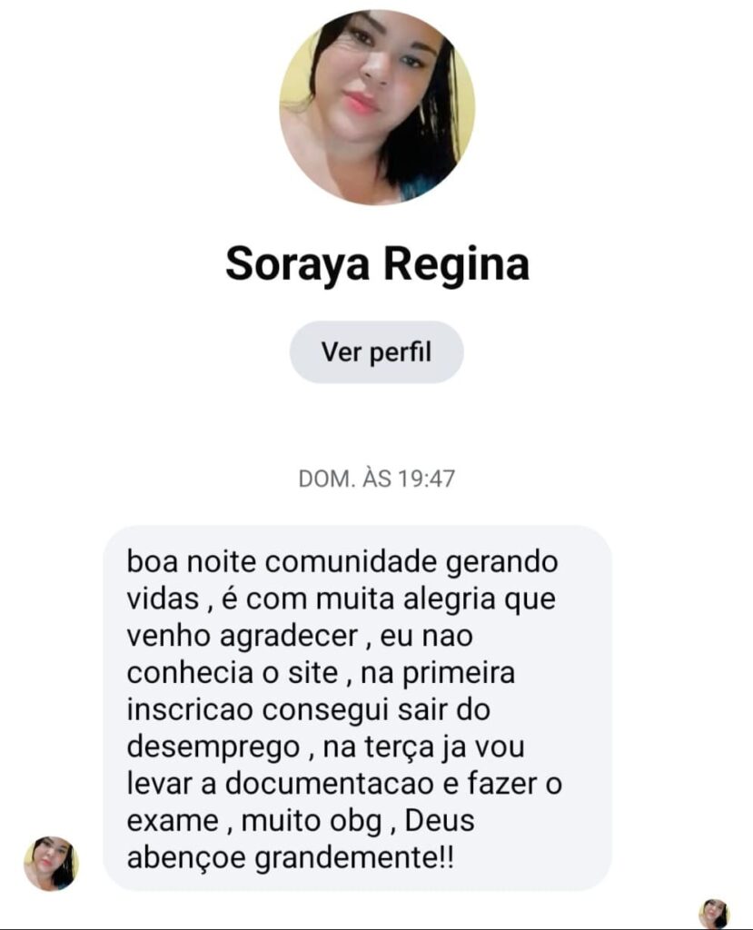 Testemunho da Soraya Regina que participou da Ação de Empregos da Comunidade Católica Gerando Vidas e conseguiu o trabalho.