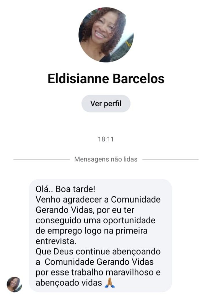 Testemunho da Eldisianne Barcelos que participou da Ação de Empregos da Comunidade Católica Gerando Vidas e conseguiu o trabalho.