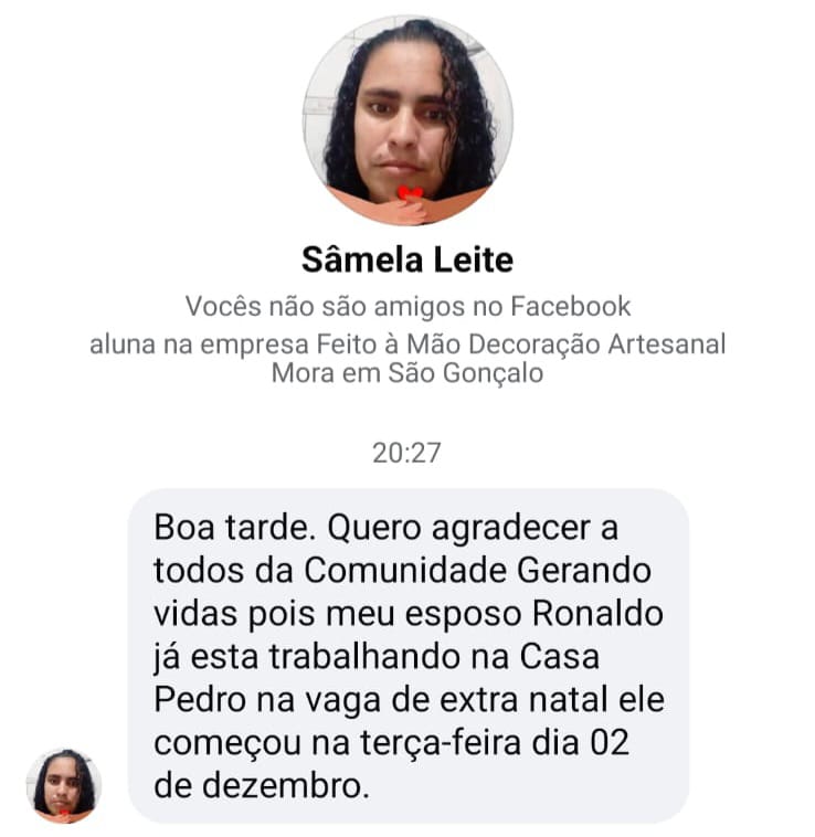 Testemunho da Sâmela Leita em agradecimento de seu esposo Ronaldo que participou da Ação de Empregos da Comunidade Católica Gerando Vidas e conseguiu o trabalho na Casas Pedro.