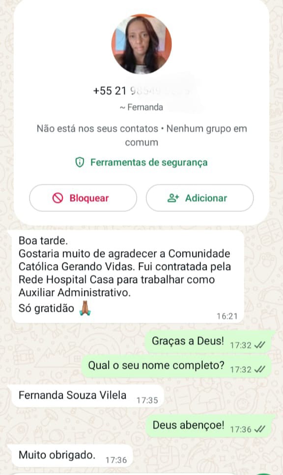 Testemunho da Fernanda que participou da Ação de Empregos da Comunidade Católica Gerando Vidas e conseguiu o trabalho na Rede Hospital Casa, na função de Auxiliar Administrativo.