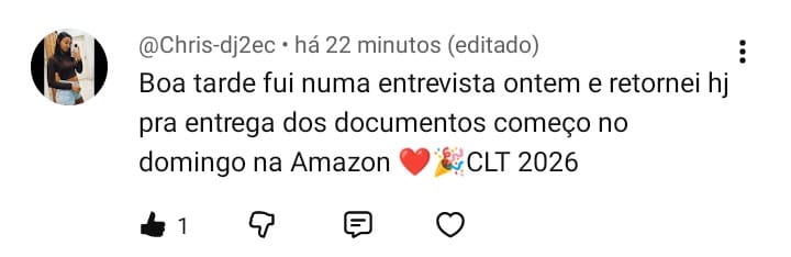 Testemunho de uma candidata que participou da Ação de Empregos da Comunidade Católica Gerando Vidas na QUINTA-FEIRA, 8 de Janeiro, foi APROVADA e já começará a trabalhar na empresa AMAZON, na função de Auxiliar de Logística.