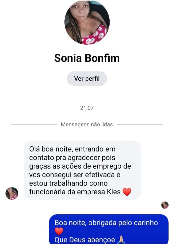 Testemunho da SÔNIA BONFIM que participou da Ação de Empregos da Comunidade Católica Gerando Vidas e conseguiu o trabalho na empresa KLES na função de RECEPCIONISTA.