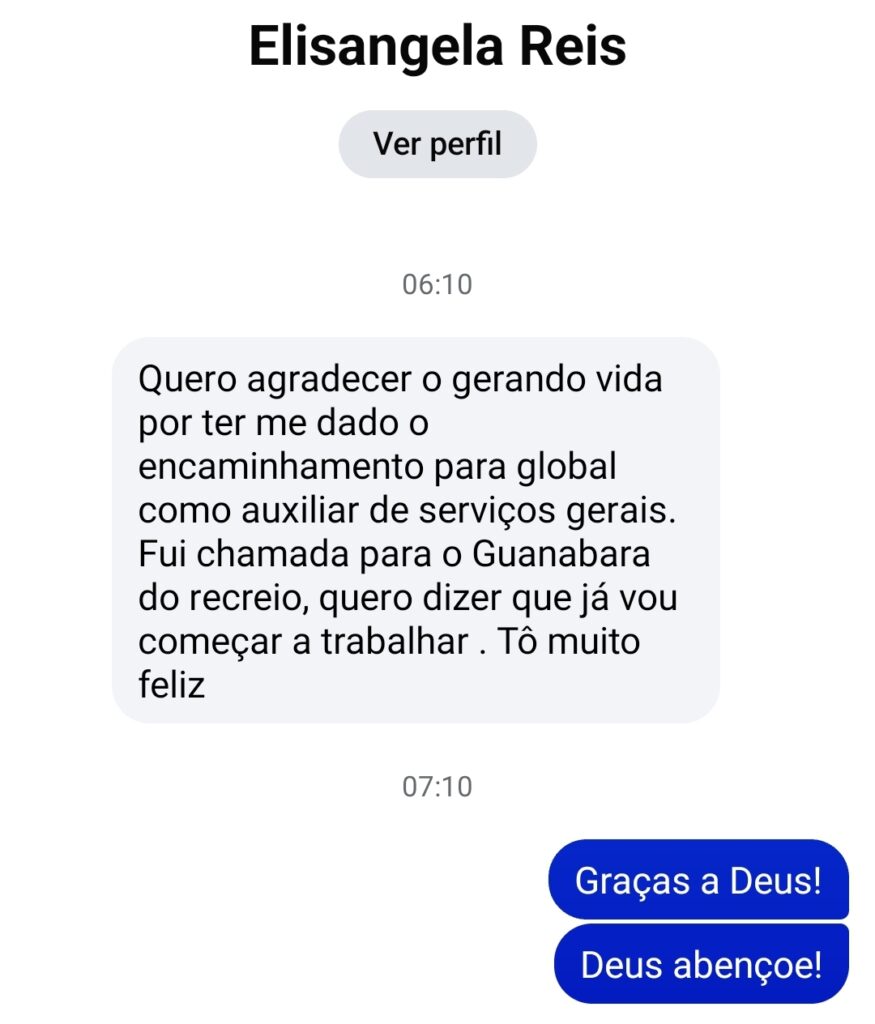 Testemunho de uma candidata que participou da Ação de Empregos realizada pela Comunidade Católica Gerando Vidas e conseguiu o trabalho na supermercados GUANABARA.