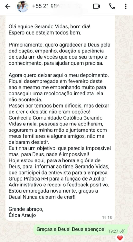 Testemunho da Érica que participou da ação de empregos da Comunidade Católica Gerando Vidas e conseguiu trabalho no Grupo Prática na função de Auxiliar Administrativo.