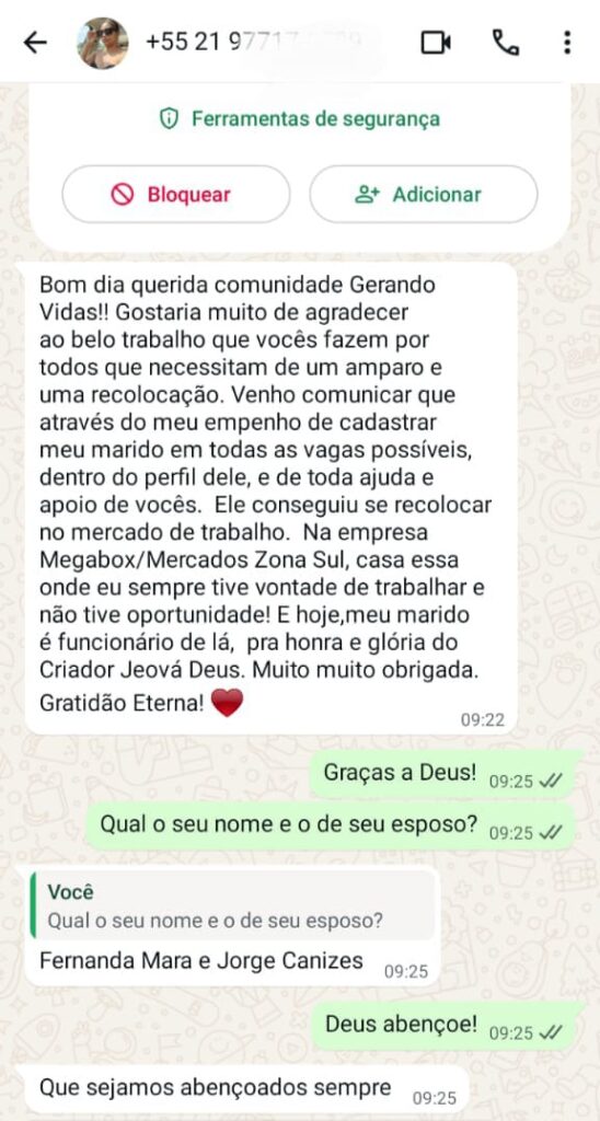 Testemunho da Fernanda em agradecimento pela conquista do trabalho de seu esposo Jorge na rede de supermercados Zona Sul / Megabox.